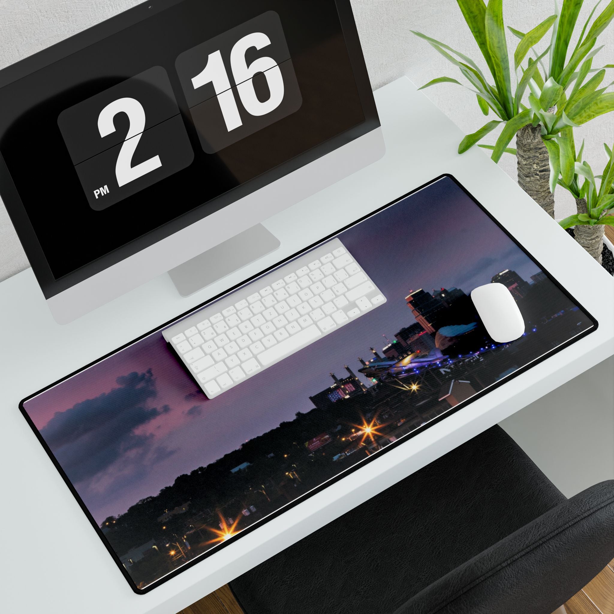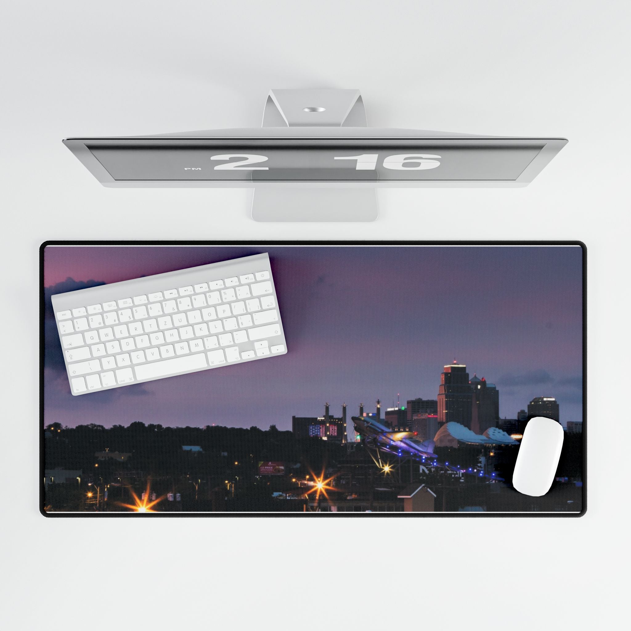 Bring the beauty of Kansas City to your workspace with this Desk Mat featuring a stunning view of the downtown area framed by The Roasterie's iconic roof top cargo plane. Perfect for those who love cityscapes and urban vibes, this Desk Mat adds a touch of sophistication to your desk. Ideal for Kansas City enthusiasts, travelers, and urban explorers. Great for gifting during holidays, birthdays, or as a housewarming present.